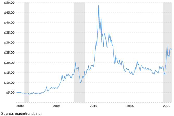 Let’s now move to the current silver bull market that I believe began in 2001. The following chart shows us silver prices since 2000, not adjusted for inflation.