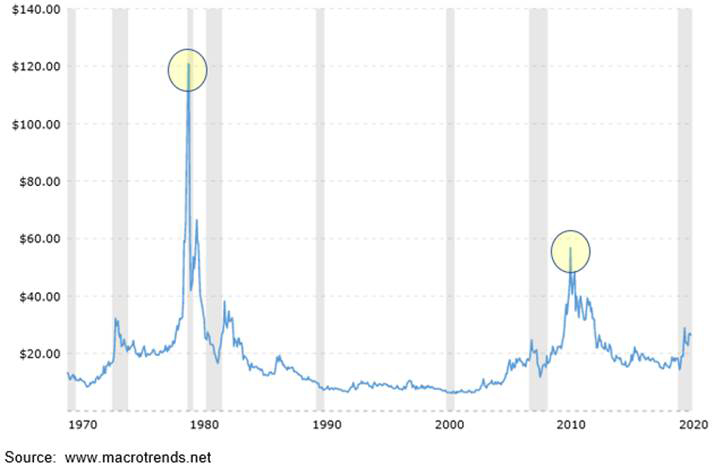 If we consider inflation-adjusted silver prices going back to 1970, we see that the peak reached in 1980 was actually $120/ounce in today’s dollars, and that’s using government sanctioned inflation statistics, which tend to be well below what we experience in everyday life.