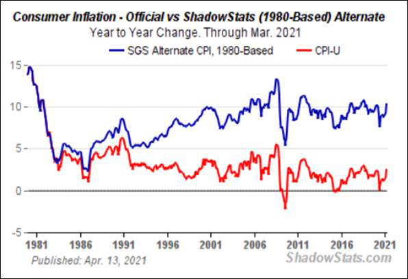 Considering the old way of calculating inflation, which the U.S. abandoned decades ago and I reference below from Shadowstats.com, a realistic inflation rate would have averaged 7%–8% since 1980 (triple official inflation), which would mean an equivalent silver price of $240–$360 dollars at the 1980 peak.