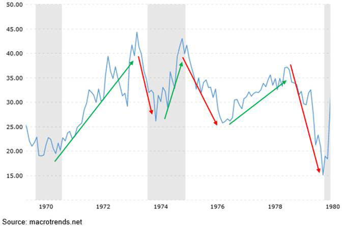 Here’s a chart of the gold silver ratio during the 1970s silver bull market.